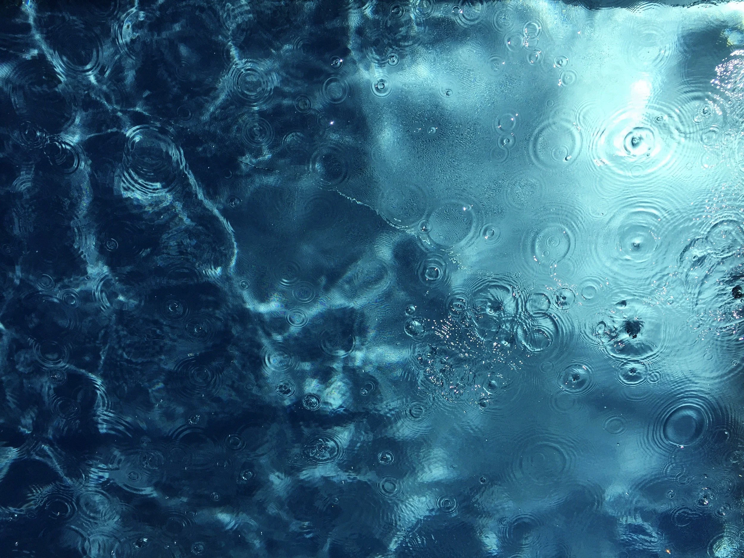 Water droplets cause circular ripples on the surface of a deep blue body of water.